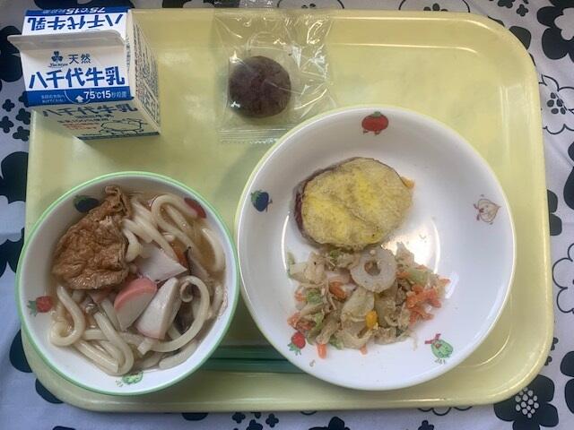 献立:きつねうどん、さつまいものてんぷら、ささみのごますりあえ、おはぎ