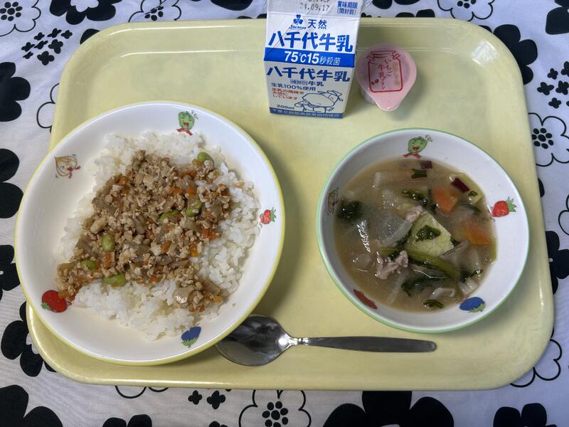 献立:とりと野菜のそぼろ丼、牛乳、さつま汁、いちご牛乳プリン