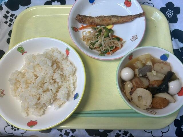献立:茶飯、ししゃものからあげ、もやしのサラダ、ひとくちおでん