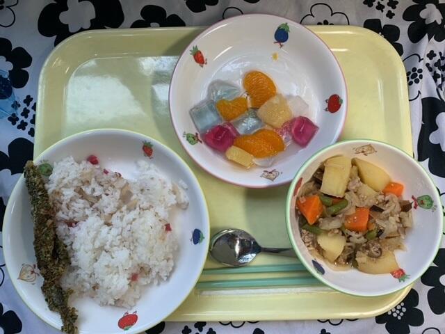献立:うめたくごはん、ししゃもの青のりフライ、じゃがいものそぼろに、ゼリーポンチ