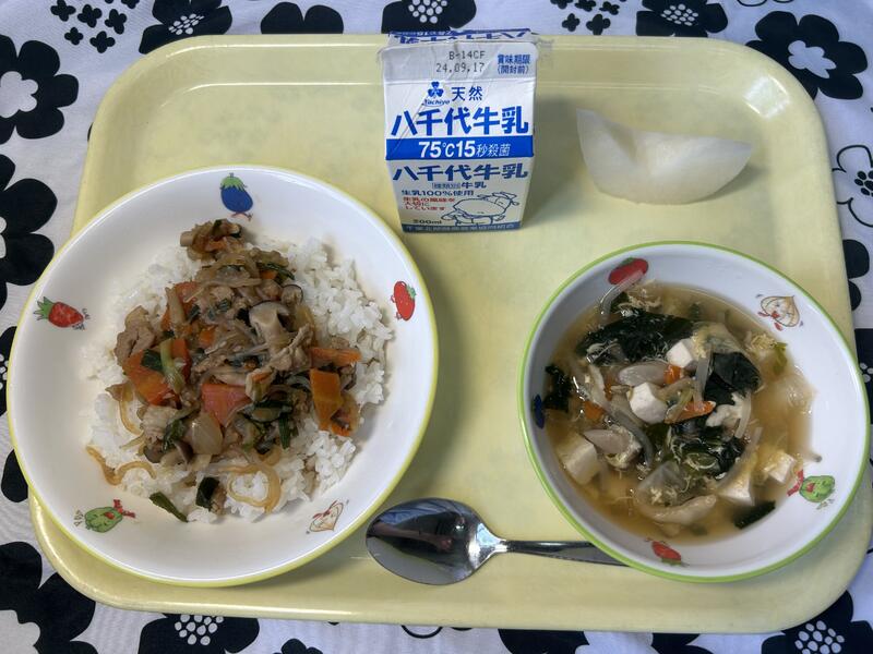献立:韓国風豚丼、牛乳、キムチと卵のスープ、梨(市川の梨、にっこり)