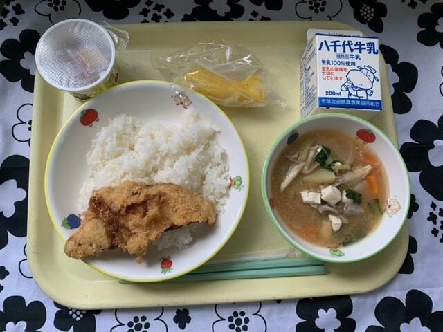 献立:ごはん、カップ納豆、アジフライ、豚汁、れいとうパイン