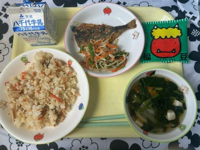節分献立 投稿日時 : 2024/02/06 編集長 2/2(金)は翌日の節分の献立でした。 献立:大豆ご飯、いわしのカレー揚げ、いんげんのごまあえ、すましじる、節分の福豆 福豆は、大豆のほか、さつまいものかりんとう、いわしスナックの入ったものを注文しました。