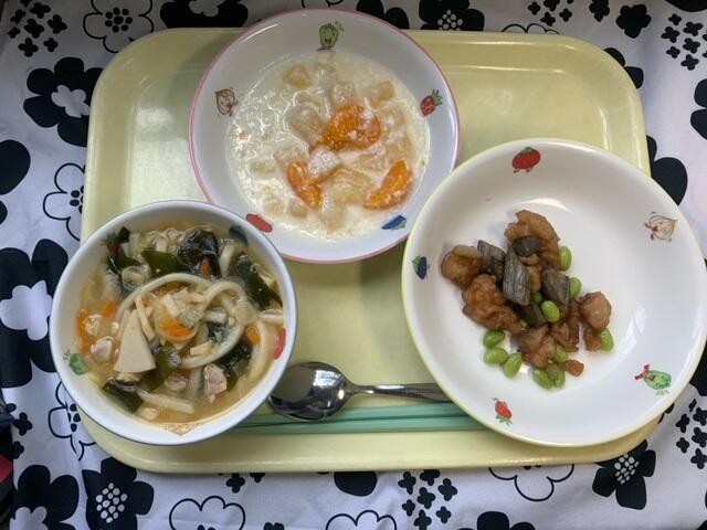 連休あけの給食です 投稿日時 : 2023/05/08 編集長 ゴールデンウィーク明け、寒い1日となりました。 今日はそんな寒い日にぴったりの、「にこみうどん」をメインとした献立でした。 献立:わかめうどん、とりとごぼうの甘辛揚げ、フルーツヨーグルト