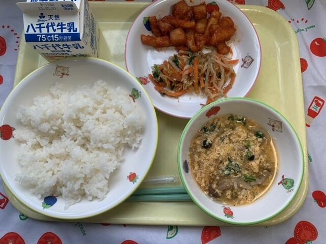 献立:ごはん、イカとポテトのチリソース、ナムル、キムチと卵のスープ