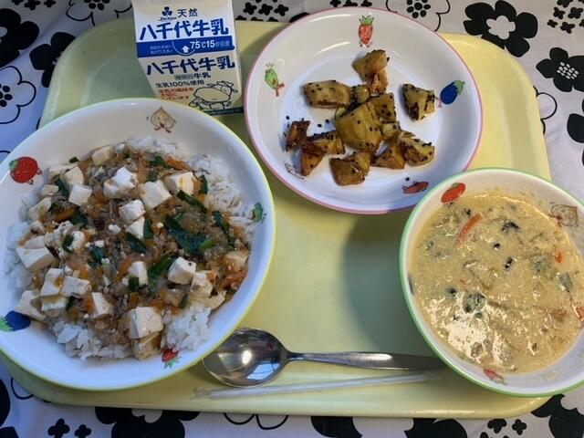 献立:マーボー丼、中華風コーンスープ、大学芋