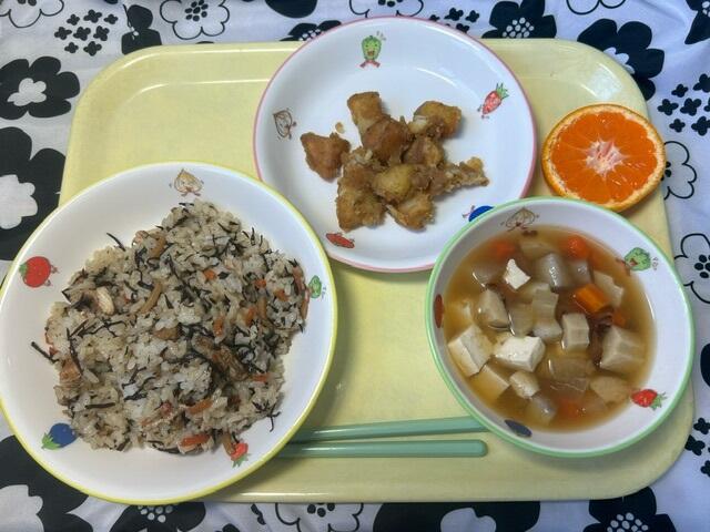 献立:ひじきごはん、みそポテト、のっぺい汁、花みかん
