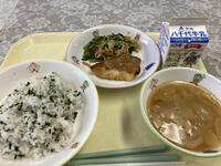 献立:ごはん、ちくわの磯辺揚げ、鶏肉ときゅうりの和え物、大根とわかめのみそ汁、そら豆