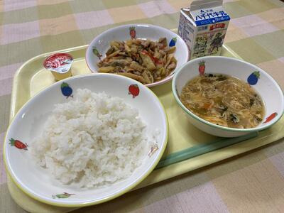 ごはん、チンジャオロース、かきたま汁、一口すりおろしりんごゼリー、牛乳