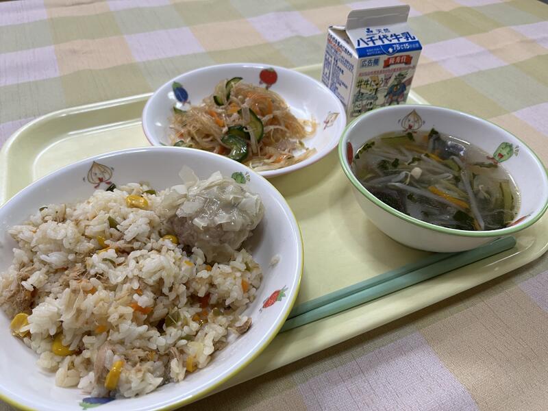 献立:ツナチャーハン、華しゅうまい、はるさめサラダ、中華スープ