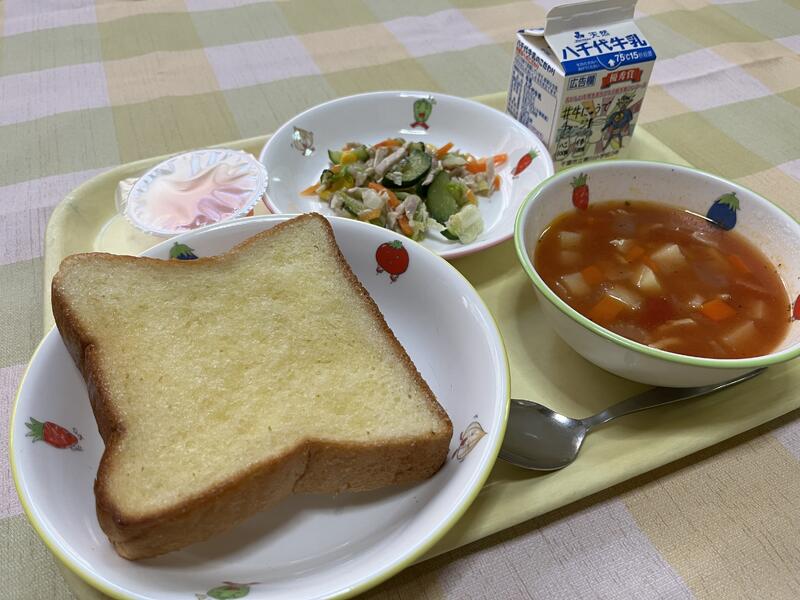 献立:シュガートースト、ハムサラダ、ミネストローネ、ピーチゼリー、牛乳