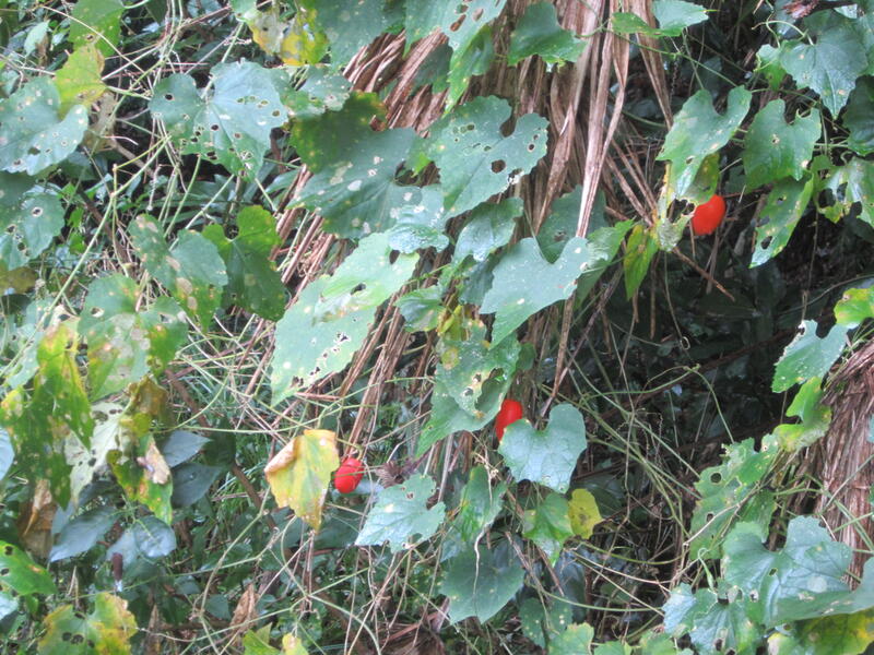 カラスウリをみつけ「真っ赤な秋」の歌とつなげて、「これの事か」と納得する児童。