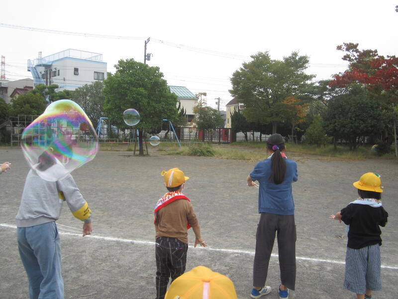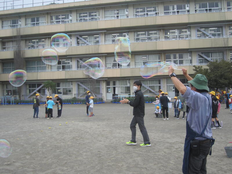 大きく膨らんだシャボン玉が空に浮かび上がると、校庭に大きな歓声が上がりました。