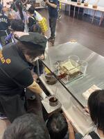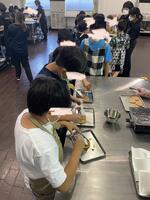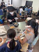 工場見学と合わせてしょうゆ作りをしています。初めての体験を楽しんでいるようです。