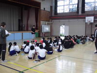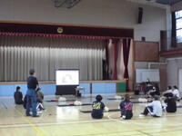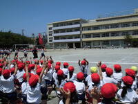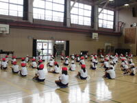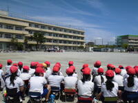 1年生の体育の終わりのあいさつの様子です。背筋をピン!みんな先生の方を集中してみていました。先生が一歩前に出たら、きちんと挨拶(お辞儀)ができていました。成長していますね。もう、すっかり小さな学生です。