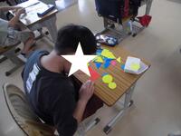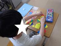 かぜのこ学級は、算数の勉強です。「形作り」どの形を何枚使って作ったかな?