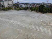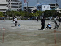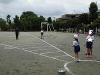 校庭では、50Mの速さとソフトボール投げの距離を測ります。