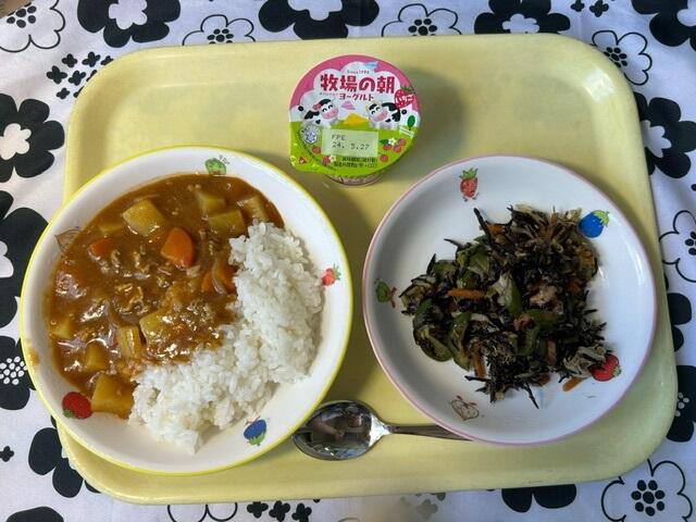 カレーライス献立 投稿日時 : 2024/05/15 編集長 今日は運動会の予行練習でした。 慌ただしい1日なので、今日は定番で配膳しやすい「カレーライス献立」にしました。 献立:カレーライス、牛乳、ひじきの炒めもの(※ひじきとツナのサラダから変更)、ヨーグルト(いちご)