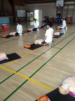 講習の中で、心肺蘇生(胸骨圧迫、人工呼吸)とAEDの使い方を行いました。これから水泳の学習やその他体育の学習の中でも、心肺蘇生法やAEDなどを突然わなければならない時があるかもしれません。万が一に備えて、迅速に、確実に大切な命を救う方法を身につけるための講習です。