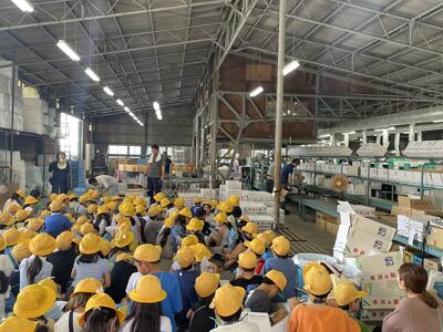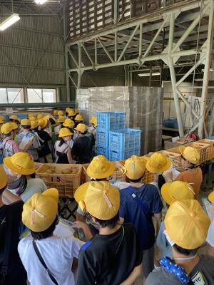 梨の選果場を見学中です。市川の美味しい梨が運ばれるまでを学びます。