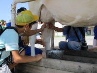水に落ちてしまったら、「浮いて待つ」のが基本です。背浮き(上をむいて浮かぶ)の練習をしましたが、なかなか浮いていられません。こわがらず力を抜くことが大切です。ペットボトルを浮き袋として使って浮いてみると、今度は長い時間浮いていられる子が増えてきました。あごに当てたりおなかに抱えたり自分に合った場所を見つけました。服を着たままだと泳ぎづらいことも感じました。