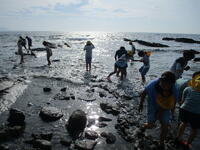 マザー牧場最後の体験は、畜産体験です。乳しぼりと、乳牛小屋を見学して、飼育の秘密を伺いました。マザー牧場を満喫した後は、館山市の沖ノ島に移動し、磯遊びをしました。濡れるのも構わず海に向かう子もいました。服が濡れた子はバスのシートを濡らさないようにビニールを敷いて宿まで移動です。ほぼ予定通り宿に到着しました。到着時には、暑さでお疲れ気味の子もいましたが、豪華な夕食を前に元気が回復したようです。みんなモリモリ食べていました。中にはご飯を5杯おかわりした強者も…。今のところ体調不良の子は見られません。明日も元気に一日過ごして、元気に帰りたいと思います。
