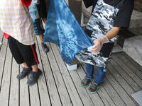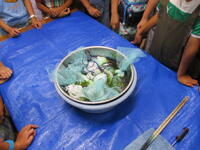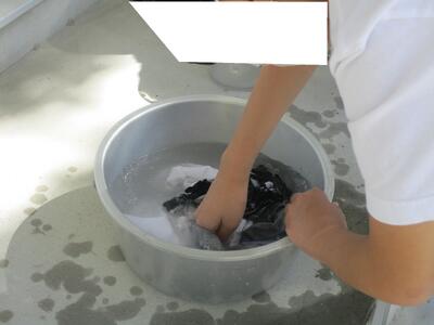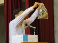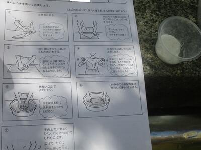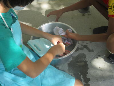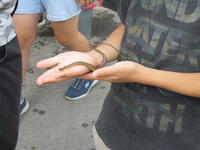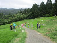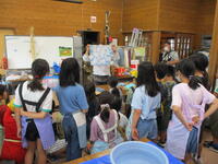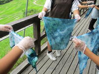 鋸山のあとは、お楽しみのお土産タイムです。南房総のお土産、ご家族の皆様に喜んでもらえるかな?そして、昼食を食べ鴨川市の大山千枚田に向かいました。世界で一枚だけの藍染めハンカチができました。藍染めの先生のお話していた大切に使うための5つの約束を覚えていますか?そのうちの一つ、「今日持ち帰ったら水洗いしてくださいね。」もうしましたか?藍染めのあとは大山千枚田の生き物について教えていただきました。大人気だったのは生きているヘビをさわらせてもらうこと。私は遠慮しておきます…。そして実際に千枚田にいる生き物を採集しました。たくさんいたのはカエルでした。全長1センチくらいのカエルがたくさんいました。二俣のプールのオタマジャクシよりも全然小さいです。