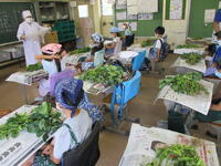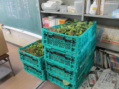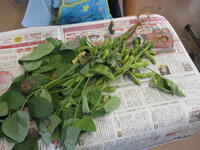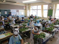 今日は、3年生が給食に出す枝豆のさやもぎをしました。箱に入った茎についた大量の枝豆が運ばれてきました。ひとつひとつ茎からとっていきます。昨日抜いたばかりの新鮮な枝豆です。上の方に向かって引っ張るときれいにとれます。二俣小の給食室では、高谷中の分も作っているのでおよそ700人分です。とてもおいしい枝豆でしたが、3年生は苦労した分、格別の味だったのではないでしょうか。