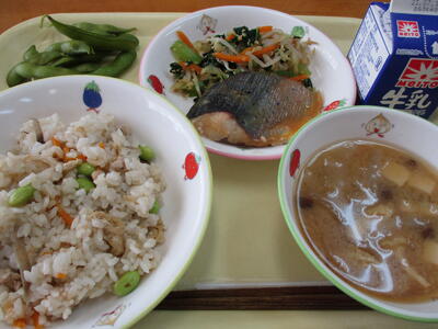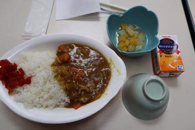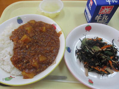 献立…大豆入りひき肉カレーライス ひじきのマリネ レモンゼリー 牛乳