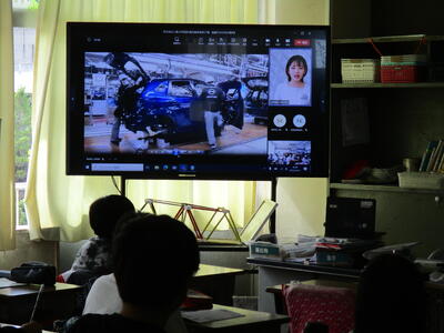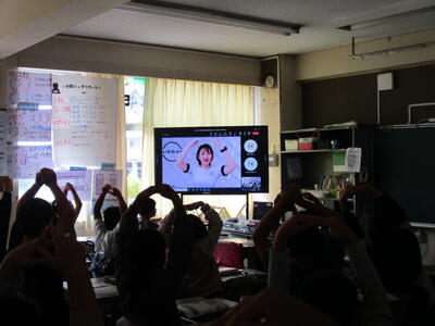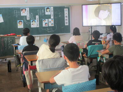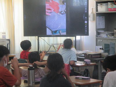5年生は、図工で電動糸のこぎりを使って掲示板を作ります。その使い方を大型テレビを使って確認しています。