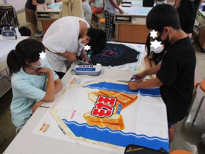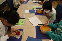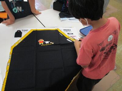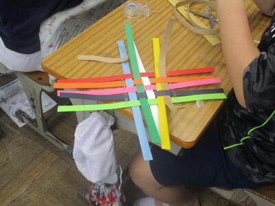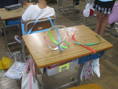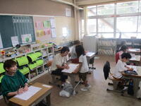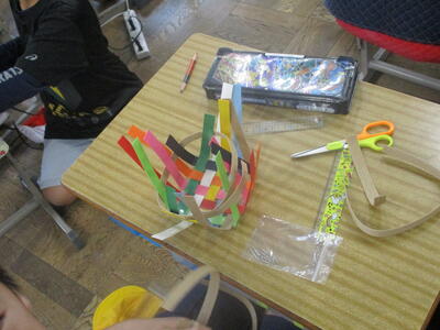 1年生が、ほかけぶねづくりに取り組んでいました。身近にある材料を使って、帆と胴体を組み合わせていきます。はさみやのり、テープなどの使い方が上達してきました。みんな黙々と製作しています。