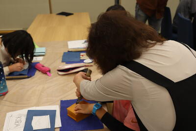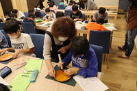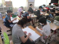 1,2時間目は5年生。課題は「世界の国」です。先生が全体指導のあと、10人くらいずつのグループに分けて、実際に書いてくださいました。流れるような筆さばきで作品を仕上げていきます。子どもたちも見とれています。書道部員の2人は、書いているところを回って、朱墨で添削してくれました。満足いく作品が仕上がったかな…?