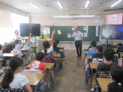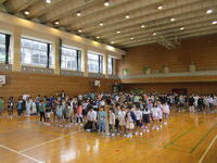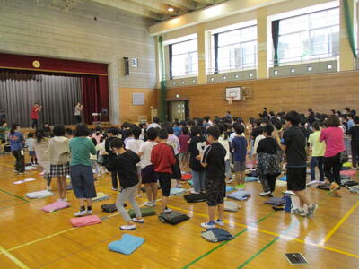 40日余りの夏休みが終わりました。夏休み明け初日なので、体育館で朝会を行いました。まずは校歌です。校長先生からは、夏休み明けもしっかりと目標をもって生活しましょう、生活のリズムを早く元に戻しましょうという話がありました。生活目標についての話では、「気持ちのよいあいさつをしよう」という目標に合わせ、「あ」相手を見て、「い」いつでも、「さ」先に、「つ」続けて あいさつができるようにしていきましょう、という話でした。いつも心がけていられるといいですね。