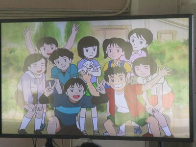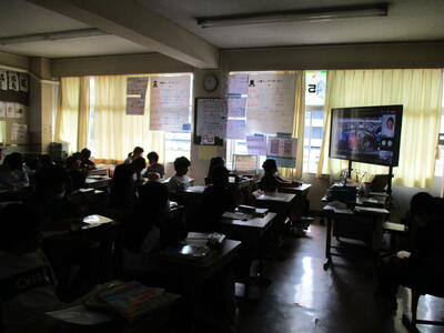 各教室には65インチの大型提示装置が導入されています。テレビとしての機能はもちろん、パソコンとつないで画面を共有したり、実物投影機をつないでノートを拡大したり、教科書を映して問題を提示したりするなどして活用しています。タッチ機能も付いているので、黒板の代わりに文字を書くことも可能です。視覚を生かす取り組みを考えていきたいと思います。