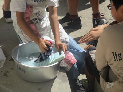 4年生は、水あそ…いや、理科「とじこめた空気や水」で学習したことを実際に確かめています。水は押し縮められないので、片側を押すと反対側から出ていきます。この性質を応用して、ふんすいや水鉄砲であそ…学習しています。暑い今日にピッタリの学習です。