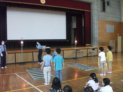 2時間目には、1年生と2年生が学校探検をしました。先輩の2年生が、1年生を案内しています。「ここは〇〇〇。△△△するところだよ。」教室の説明もしています。行った教室には、カードにシールを貼るのですが、1年生はそっちに夢中の子もちらほら…。しっかり聞いて覚えてくださいね。