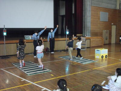 1年生は4時間目に行いました。町にひそんでいる危険な場所の学習をして、安全な道路の渡り方を実際にやってみました。横断歩道の信号が青ならば車は止まっているはず…ではなく、止まったかどうかを自分の目で確認するようにしましょうね。