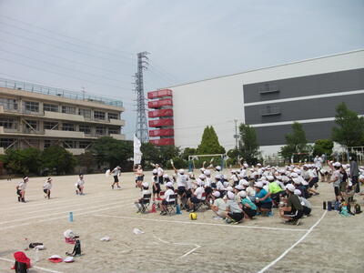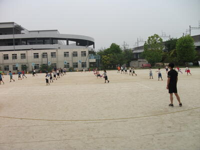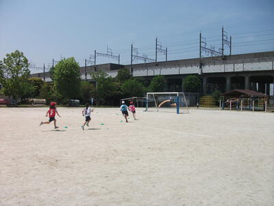 そのあとは鬼ごっこで楽しみました。広い校庭なのたくさん走れます。今日は天気もよく、みんな汗びっしょりです。