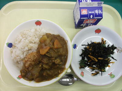 給食は明日の運動会のためにカツ(勝つ)カレーです。元気いっぱいになったかな?
