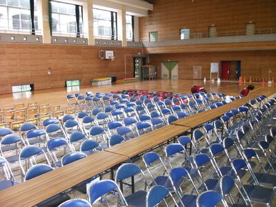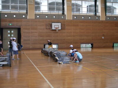 午後の前日準備は、パイプいすを出すのが意外と大変なのです。重いし、数は多いし…。終わった後もきれいにしなければいけないし…。本当にご苦労様。明日の片付けもよろしくね。