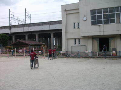 運動会の練習が始まっています。転んで大きなケガをしないように校庭の石を拾っています。