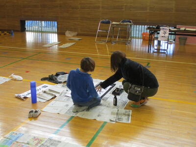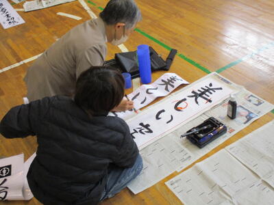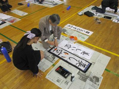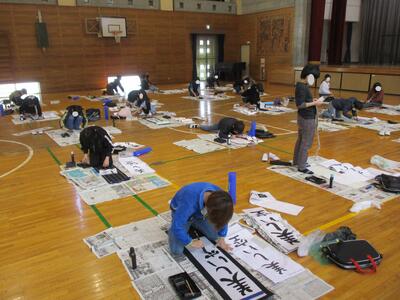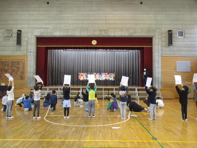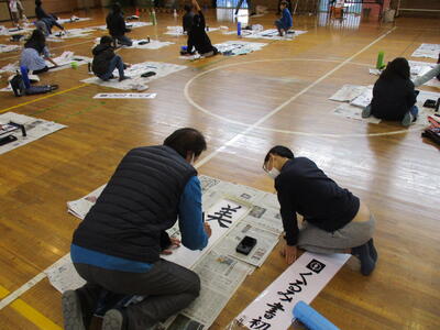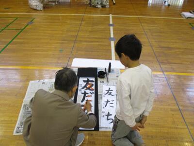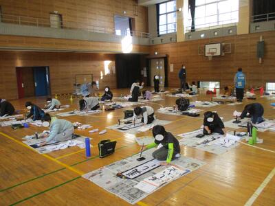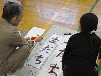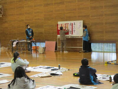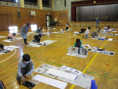 今日は、3・4年生が体育館で書初めの清書を行いました。今回も、12月に練習した時と同じ、地域の先生にご指導をしていただきます。