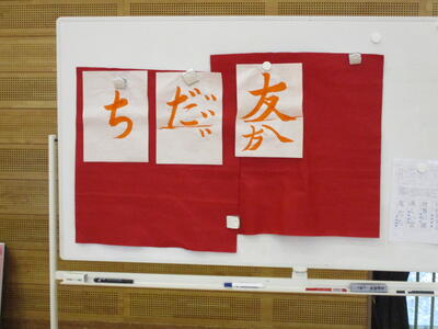 3,4時間目は3年生。課題は「友だち」です。3年生は初めての書初めです(12月に練習はしましたが…)。文字数は少ないですが、三文字をバランスよく書くのは実に難しい。下が余ってしまう子も多かったです。バランスよく書くために紙を折ることもありますが、きれいに三つに折るのも難しいです…。3年生は人数が少ないので、講師の先生に何度も添削していただきました。できあがりはどうかな?