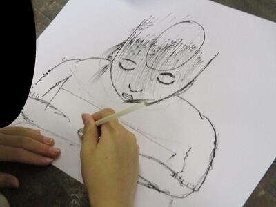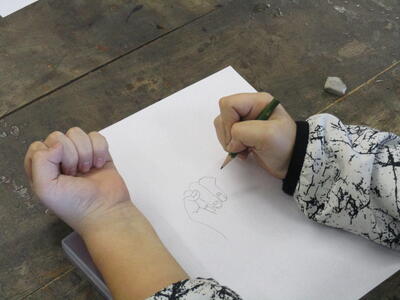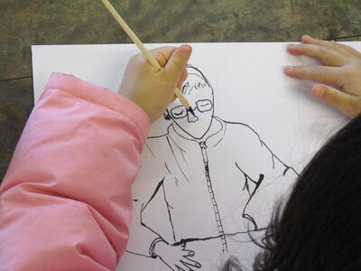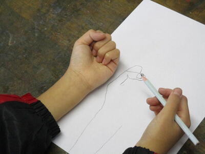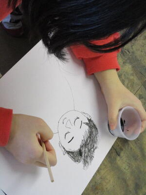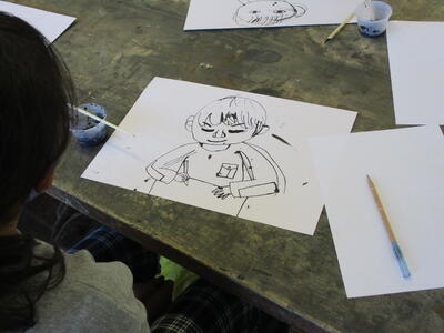 まずは、自分の手をよく見てデッサンをします。指の重なりや向きをじっくり観察します。次に前に座っている友だちがデッサンしている姿をよく観察します。先生の、友だちの見え方についての質問、「首は見えてたかな?」下を見てデッサンしているので真正面からみた顔ではなく、下を見ていることがよくわかりました。それをふまえて、友だちのデッサンしている姿を割りばしペンで描いていきます。顔を描くと、真正面を見た顔を描きがちです。わずか45分のご指導でしたが、動きのある描き方を学習することができました。ご指導ありがとうございました。