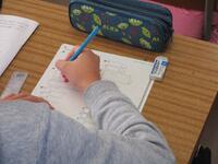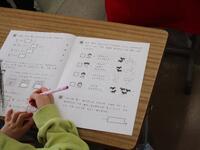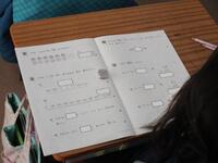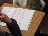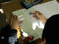 1,2時間目は4年生。課題は「美しい国」です。漢字とひらがなの大きさに注意して書きます。先生は書けた子のところをまわり、一人一人添削してくださいました。でも、どうしても漢字が大きくなってしまいがちです。バランスよく書けたかな?