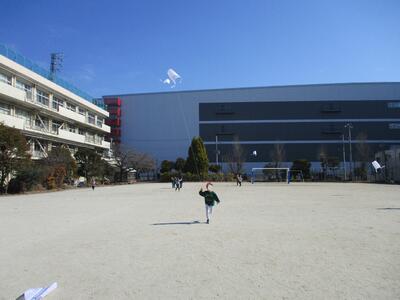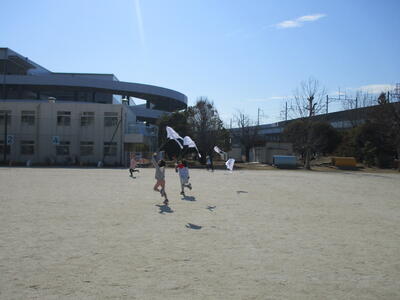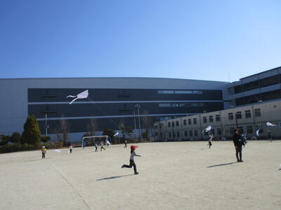 1年生は、たこあげを楽しみました。用務員さんにあげ方のコツを教わりました。今日は穏やかな天気で、風はあまり吹いていませんでしたが、スーッと上がっていきます。糸を伸ばしていかないので、たこあげというよりもたこ走りでしたが…(^O^)。でもみんな楽しそうに走っていました。青空にたこが映えます。