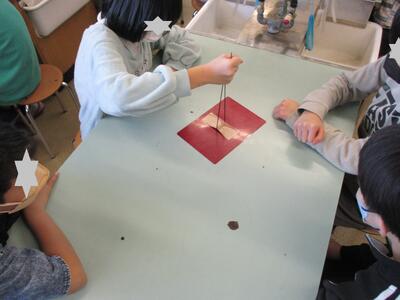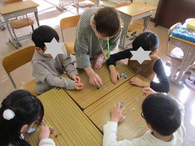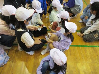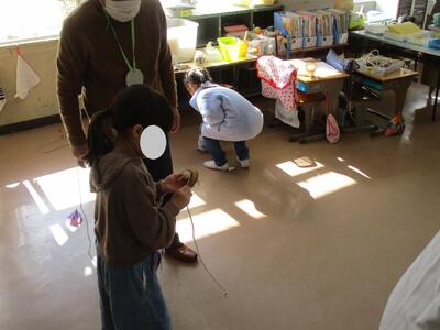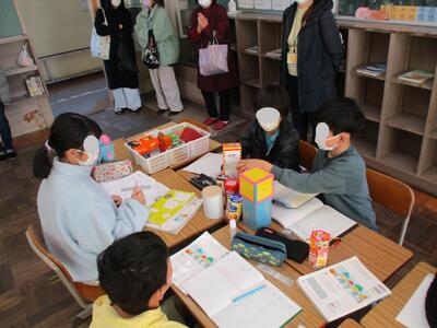 2年生が自分たちで作ったおもちゃで遊んでいます。さすが2年生、説明書をよく見て手早く作り上げます。できあがったおもちゃで、お友だちとなかよく遊んでいる姿は、見ていていやされます。手作りの素朴なおもちゃでも十分に楽しめますね。