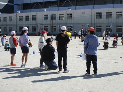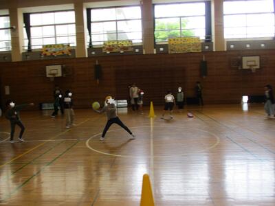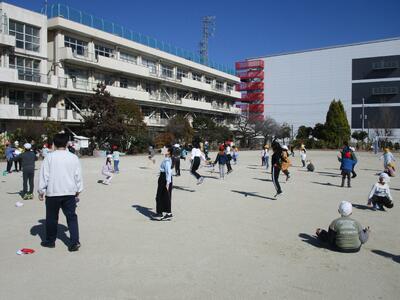 2・5年生は、名刺交換のあとは全員で「だるまさんがころんだ」をしました。1・6年生は教室での名刺交換の後に「ドッジボール」。1年生も楽しそうにボールを投げていました。6年生の優しさが垣間見えました。3・4年生は名刺交換のあとは「フリスビードッジ&ドッジボール」でした。年齢差の一番近いペアなので、3年も4年も全力で取り組みました。