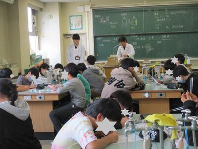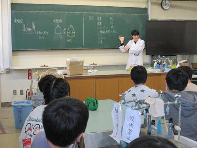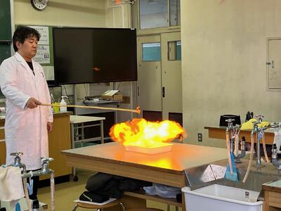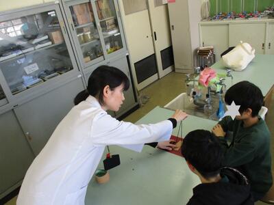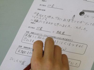 今日は、6年生が高谷中を訪問し、理科の授業を体験と校内見学をしてきました。理科の授業は、机の上に置いた下じきに、ひもをテープで貼り付け、持ち上げてみます。すると誰もおさえていないのに、なかなか持ち上がりません。空気の力ですね。空気に含まれる窒素、酸素、アルゴン、二酸化炭素、水素…。小学校では、酸素、二酸化炭素のはたらきについて学習します。中学校では、水素も学習します。今日は、水素の爆発を見せていただきました。風船を15cmくらいに水素と酸素を入れ、火をつけると大きな音をたてて爆発します。びっくり度150%でした。身近なところに理科の学習は潜んでいます。