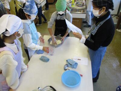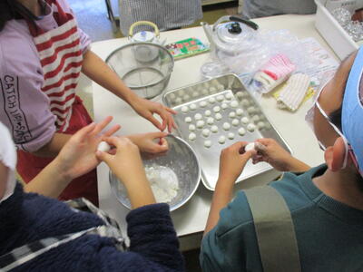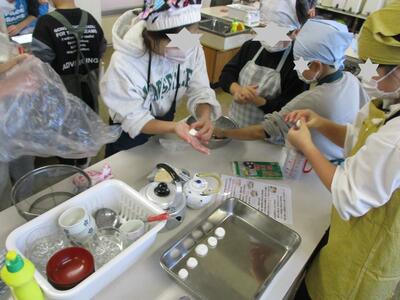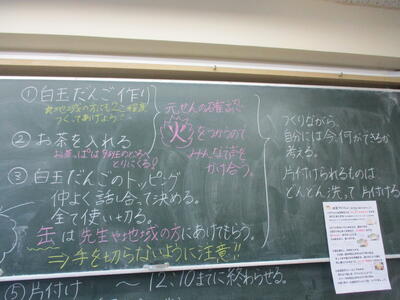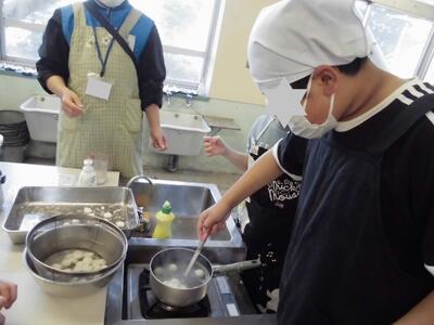 5年生が調理実習を行いました。今回も地域の方にご協力をいただきました。各グループに一人ずつ入っていただけるので安心感がぐんと増します。器具を洗い、白玉粉をこねてゆでます。お湯をわかし、お茶を淹れてみんなで食べます。たったこれだけのことですが、経験のない子にとっては実に難しいことなのです…。今回は、どのグループも上手に出来上がり、おいしく食べることができました。ご協力に感謝いたします。ご家庭でも一緒に作っていただき、ほっとひと息ついてみてはいかがでしょうか?